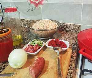 Döküm tencereye yağı ve yemeklik soğanları alıyoruz, soteliyoruz. Sırayla yazdan doğrayıp buzluğa koyduğumuz biberleri ekliyoruz. Yoksa taze de kullanabilirsiniz. Dörde bölerek ince ince doğranan sucuğu da ekliyoruz. Sotelemeye devam edip salçaları ekliyoruz. 5 bardak kaynar suyu koyuyoruz. Kaynadıktan sonra kuru fasulyeyi ekliyoruz. Baharatları ve tuzunu ekleyip kapağını kapatıyoruz.